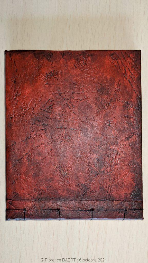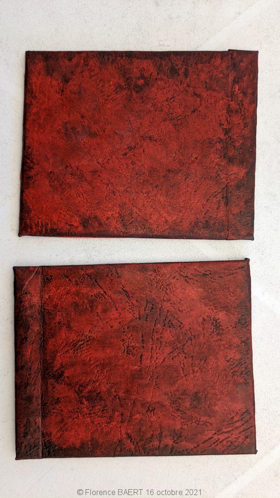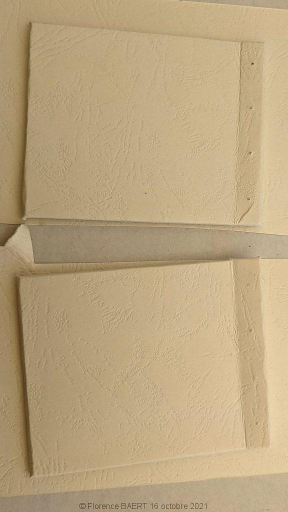 Après une tentative ratée de recouvrir ces structures avec un tissu pseudo-cuir, j’ai décidé d’utiliser du papier épais imitation cuir. Le voici découpé et collé.